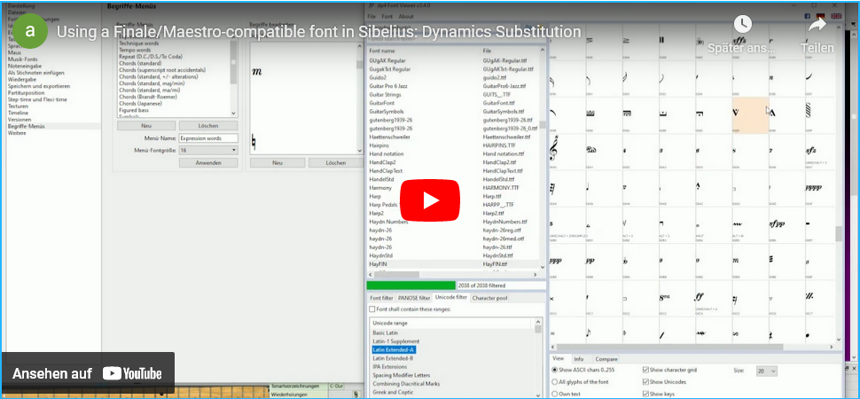 6. Copy&paste the missing symbols from the font viewer over the wrong letters in Sibelius and click "Apply" (in the German video it's "Anwenden" instead of "Apply")