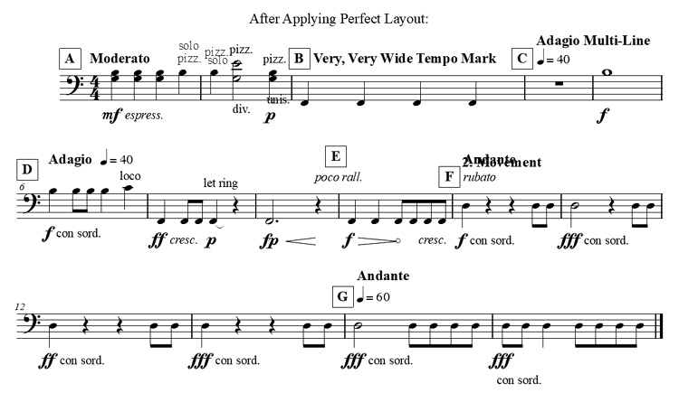 Rehearsal/Tempo Mark mark on beat 1 collides with a rehearsal letter in the next measure, Perfect Layout can broaden the measure and even move other measures to the next system (see m.3 for broadening and m.6 for moving to the next system).