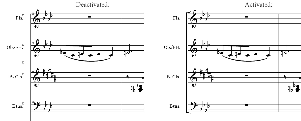 - If group brackets are automatically added, then on piano groups piano braces will be used.